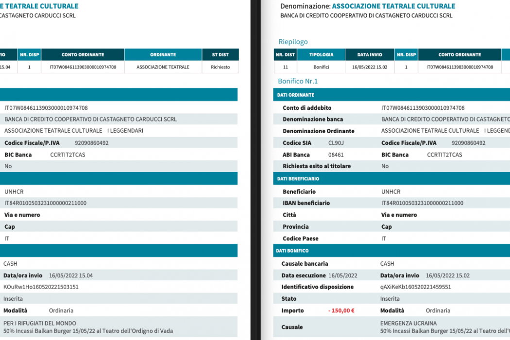 Fatti due bonifici a favore dell'UNHCR per i rifugiati Ucraini e di tutto il mondo.